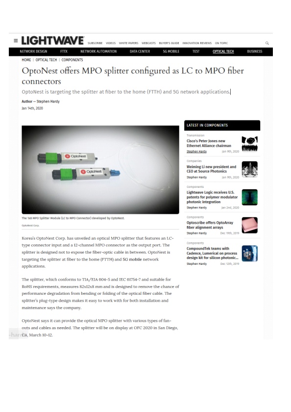 1x8 MPO Splitter Module (LC to MPO)개발 관련 Light Wave지 기사